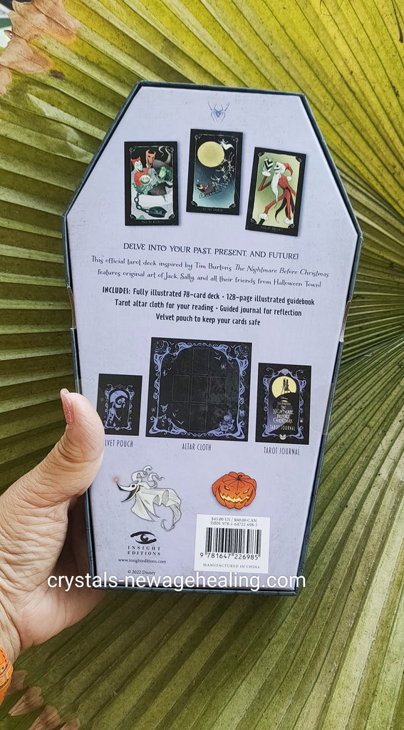 Let the citizens of Halloween Town guide your tarot practice with this sumptuously illustrated tarot deck inspired by Tim Burton’s classic film The Nightmare Before Christmas. This gift set includes a tarot altar cloth, guided notebook for reflection, and pouch to hold your cards and booklet.