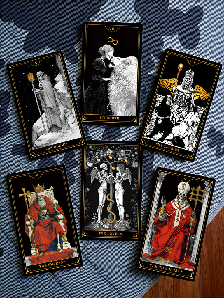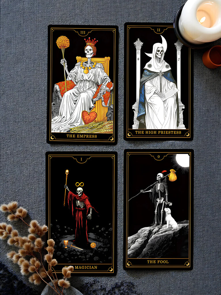 This deck reimagines the classic Rider-Waite tarot with a striking protagonist, telling a story of transformation. Skeletons, cloaked in royal robes or wielding ancient symbols, stand as timeless guides between worlds, reminding us that even in decay, there lies hope and strength. For those seeking something audacious and unapologetically gothic. Where the dead don't just speak – they reign.